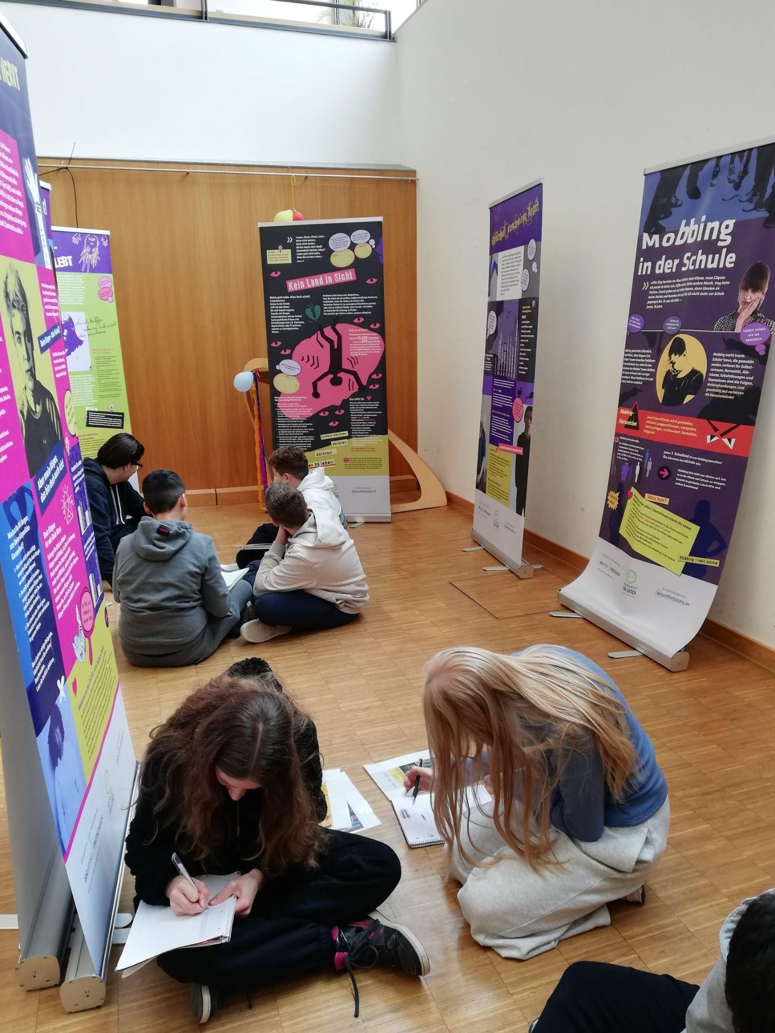 Begleitend zu der Ausstellung wurde für die Klassen der 6. bis 9. Jahrgangsstufe ein Workshop angeboten. Der Fokus: für psychische Belastungen und Krankheiten sensibilisieren, Vorurteile und Stigmata abbauen sowie Resilienz und Handlungsstrategien zur Bewältigung vermitteln. In diesem Zusammenhang wurden auch Kontaktdaten örtlicher Beratungsstellen weitergegeben und auf die Nummer gegen Kummer (Telefon: 116111) aufmerksam gemacht. Des Weiteren wurde in dem Workshop thematisiert, dass in akuten Situationen, wie Suizidankündigungen oder Hinweisen auf einen Amoklauf sofort der Notruf (Telefon: 112) zu verständigen ist.