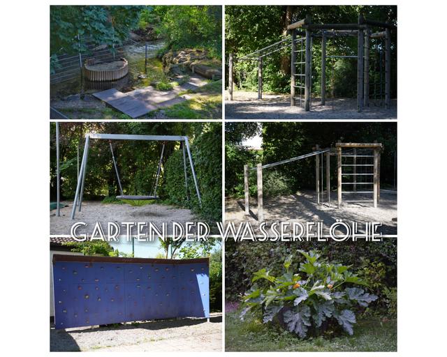 Die Wasserflöhe-Kinder genießen einen Garten mit vielen Spiel-, Bewegungs- und Entdeckungsmöglichkeiten, z.B. Kletterwand, Vogelnestschaukel, Sandbereich, ein Klettergerüst und ein Zugang zum Gröbenbach mit Wasserspielbereich. Durch die Erhaltung und Gestaltung einer naturnahen Außenfläche haben die Kinder die Möglichkeit, Pflanzen und Tiere im und am Bach zu beobachten.